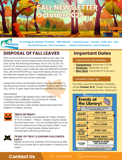 The Public Works Department would like to remind Markesan Residents that during Fall Leaf collection on Mondays: